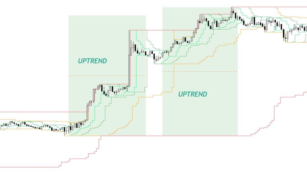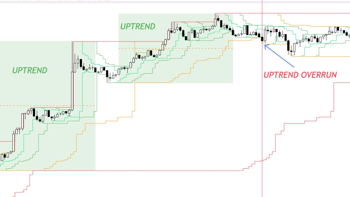 จากรูปจะเห็นว่าด้านซ้ายเป็น Uptrend มา และเมื่อสิ้นสุด ณ จุดที่กราฟแท่งเทียนปิดลงมาต่ำกว่าเส้น Keyzone 21 เส้นสีส้ม จะถือว่าเกิด Uptrend overrun ซึ่งหมายถึง แนวโน้มขาขึ้นได้จบลงแล้ว