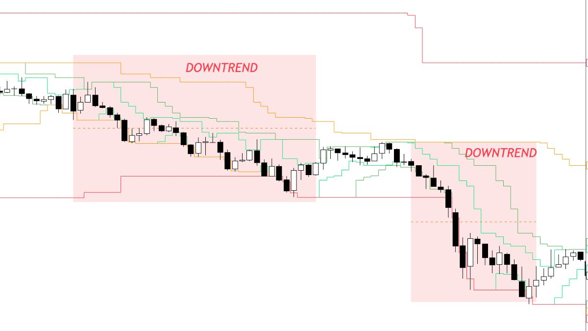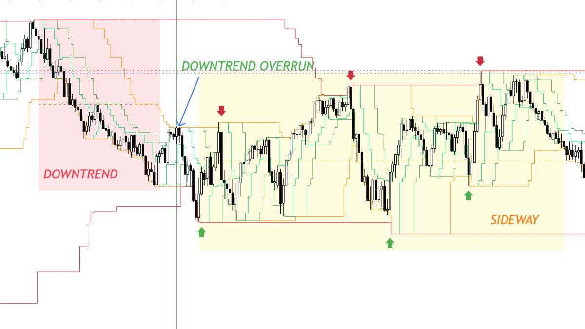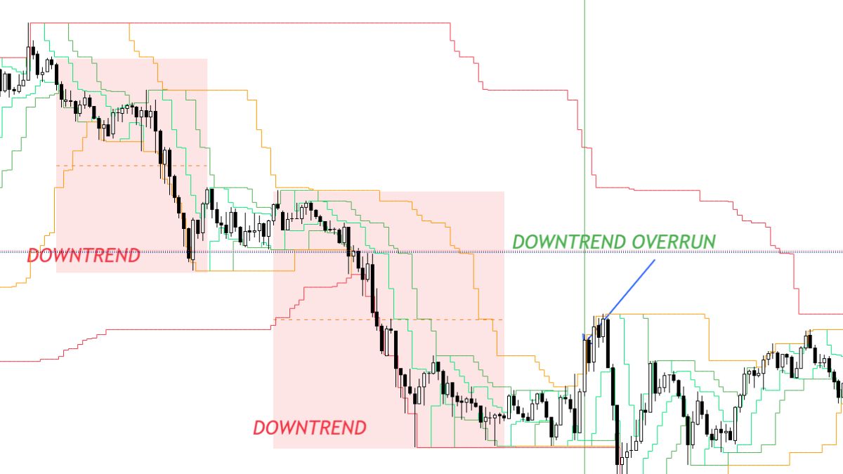 จากรูปจะเห็นว่าด้านซ้ายเป็น Downtrend มา และเมื่อสิ้นสุด ณ จุดที่กราฟแท่งเทียนปิดลงมาสูงกว่าเส้น Keyzone 21 เส้นสีส้ม จะถือว่าเกิด Downtrend overrun ซึ่งหมายถึง แนวโน้มขาลงได้จบลงแล้ว
