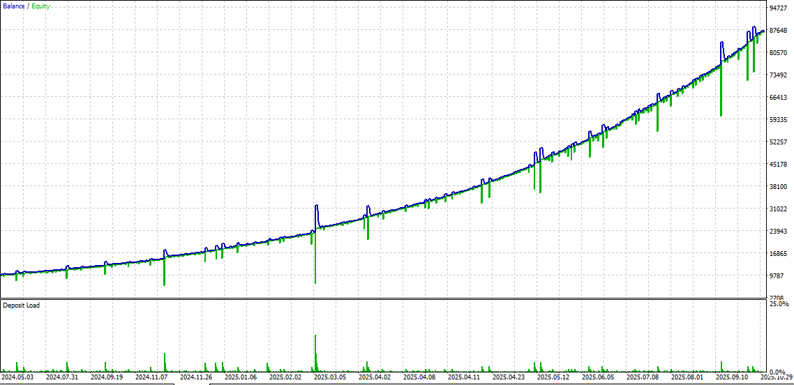 รายการ ค่าผลลัพธ์โดยเฉลี่ย Profit 770% Win Rate 55.98 % Profit Factor 2.15 Max Drawdown 20.96 % ระยะเวลาทดสอบ พ.ค. 2024 – ต.ค. 2025 (≈ 15 เดือน) ระบบผ่านทุกภาวะตลาดโดยไม่เกิด Equity Wipe และสามารถรักษา DD ให้อยู่ในกรอบต่ำตลอดช่วงทดสอบ